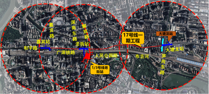 深圳市城市軌道交通17號線一期工程起始于羅湖西站,止于上李朗站,線路總長約18.6公里,設車站18座,全線采用地下敷設方式,平均站間距 1.1km。嘉賓站位于嘉賓路與和平路交叉口以南,沿和平路南北向敷設,線路出嘉賓站后沿和平路到達老街站;老街站位于和平路與深南東路交叉口以北,沿著和平路南北向敷設,老街站與1、3號線換乘;線路出老街站沿廣深鐵路方向并行向北,途經桂木坊、深圳紅桂中學、百草園幼兒園、口腔醫院、深圳市木材公司、萬科桂苑、大塘龍小區等區域后,在筍崗東路下方設大塘龍站。(詳見附圖)