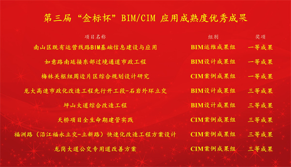 日前,由全國智能建筑及居住區數字化標準化技術委員會組織舉辦的第三屆“金標杯”BIM/CIM應用成熟度優秀成果遴選大賽公布獲獎結果,公司參賽項目在全國1500多項參賽作品中脫穎而出,攬獲8項大獎,成為全國唯一同時榮獲設計組、運維組、CIM創新組一等獎的單位。