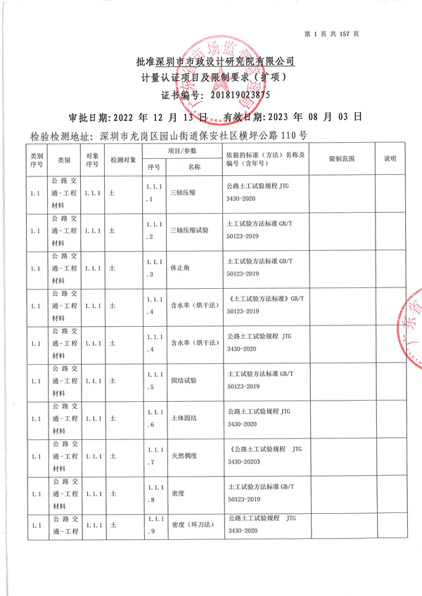 2022年11月,廣東省質(zhì)量監(jiān)督局委派6名專家來公司檢測試驗(yàn)中心開展為期2天的現(xiàn)場評審。在資料審核和現(xiàn)場實(shí)操考核結(jié)束后,評審專家一致認(rèn)為場地、設(shè)備設(shè)施、人員及管理體系等符合評審要求,準(zhǔn)予通過現(xiàn)場評審。經(jīng)過為期30多天的審批,廣東省質(zhì)量監(jiān)督局于12月19日向公司發(fā)放擴(kuò)項(xiàng)證書。至此,公司檢測能力由原來的594項(xiàng)達(dá)到了44個專業(yè)1451項(xiàng),參數(shù)覆蓋了目前鐵投城際鐵路項(xiàng)目所需參數(shù)的90%。