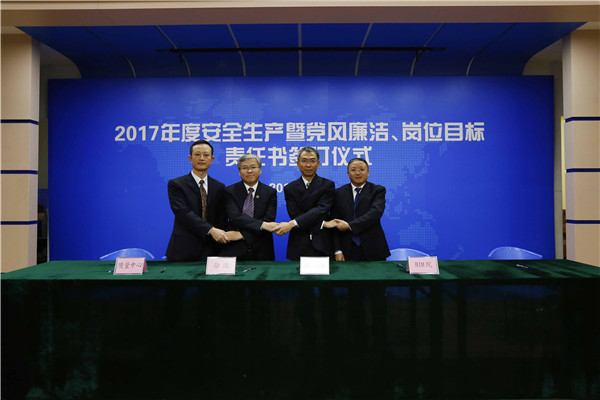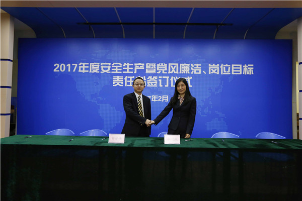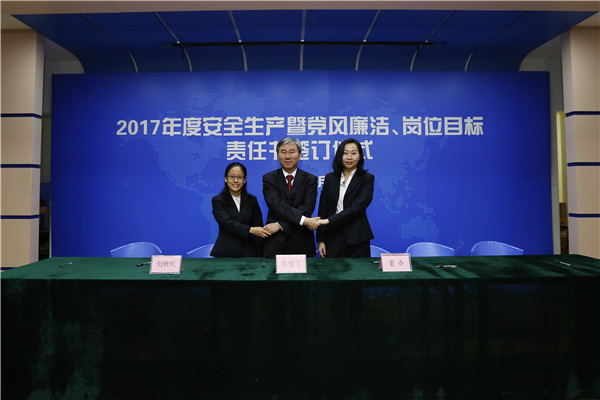 儀式開始,黨委書記、董事長陳宜言與黨委副書記、總經理蔡明和黨委副書記、紀委書記、工會主席郭明簽署了《2017年度崗位目標責任書》、《2017年度黨風廉潔責任書》及《2017年度安全生產責任書》??偨浝聿堂髋c副總經理歐陽宇峰、副總經理王建新、副總經理張健君、副總經理許華林、總工程師徐波簽署責任書。緊接著,各分管領導與分管部門負責人簽署責任書。《2017年度崗位目標責任書》的簽訂對各部門的工作目標進行了進一步的細化和分解,《2017年度黨風廉潔責任書》的簽訂是提高全體黨員和領導干部廉潔從業意識的重要舉措,《2017年度安全生產責任書》為提升我司安全生產管理水平,實現“安全生產無責任事故”的年度目標奠定良好的基礎,確保我司“項目、資金、生產、干部”四個安全,為我司打造“百年老店”的目標提供堅強的保障。