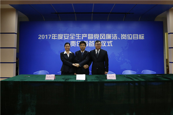 為強化我司安全生產管理,全面落實安全生產責任制,同時貫徹落實黨風廉潔建設責任制,著力提高黨員領導干部抓黨風廉潔建設的責任意識,并為全面落實公司2017年度經營管理目標任務,2月20日,我司在七樓多功能廳舉行了2017年度安全生產暨黨風廉潔、崗位目標責任書簽訂儀式。我司領導班子成員,各部門中層正、副職,分子公司負責人及外地分院負責人共計70余人參加簽署儀式。會議由黨委副書記、紀委書記、工會主席郭明主持,我司黨委書記、董事長陳宜言參加會議并發表講話。