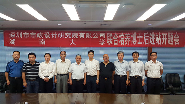 2017年7月29日下午,公司與湖南大學聯合培養博士后進站開題會在市政設計大廈三樓會議室舉行。中國工程院陳政清院士,全國工程勘察設計大師王用中、車宇琳,湖南大學華旭剛教授,東南大學宗周紅教授,地鐵集團陳湘生總工程師,深圳市人社局周寬山科長以及我公司董事長陳宜言設計大師等相關領導、專家參加會議。