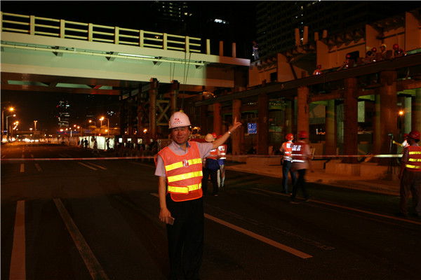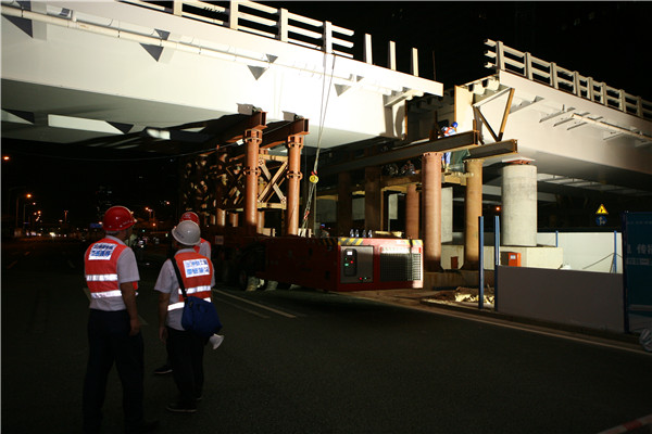 為保證架橋期間深南大道的交通連續(xù),施工采用夜間施工,選擇主線單邊雙向通行的交通疏解方案。采用SPMT模塊車架橋可以將傳統(tǒng)施工工藝7天的工期縮短為14小時左右,大大加快了整個架橋進(jìn)度,并且把對周邊環(huán)境和交通的影響降到了最低。橋梁架設(shè)期間,我公司副總經(jīng)理歐陽宇峰、橋梁總工王先前、市政四院副院長喬曉冉及項(xiàng)目組成員王延飛、孫志國等作為技術(shù)服務(wù)組全程提供技術(shù)支持。董事長陳宜言大師不辭辛苦,外地開會后晚間23:00趕回深圳,就直赴現(xiàn)場指導(dǎo)橋梁架設(shè)。