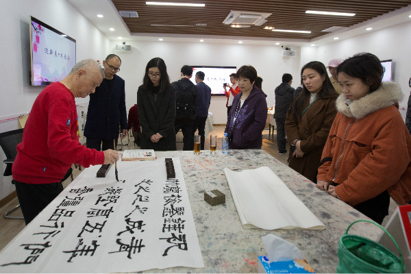 深漂藝術(shù)家魏治平老師在創(chuàng)作的間隙,為大家講述了書畫的精神內(nèi)涵以及在新時(shí)代下他對(duì)書畫的理解,生動(dòng)地將“青春踐行十九大”、“幸福都是奮斗出來的”、“逢山開路遇水架橋”等文字融入自己的書畫創(chuàng)作中,令在場(chǎng)的青年員工受益匪淺。