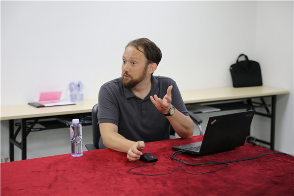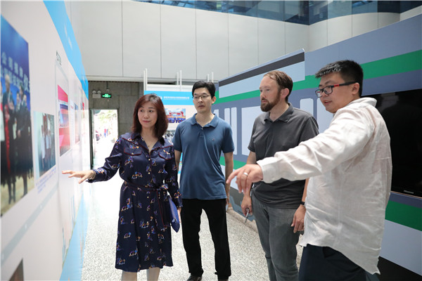 Stuart Buckenham一行在郭明的帶領(lǐng)下先后參觀了公司主樓大堂的“壯闊歲月 再尋初心”主題展、主樓六樓建筑規(guī)劃設(shè)計院,隨后前往主樓七樓學(xué)術(shù)活動室進行座談交流。
